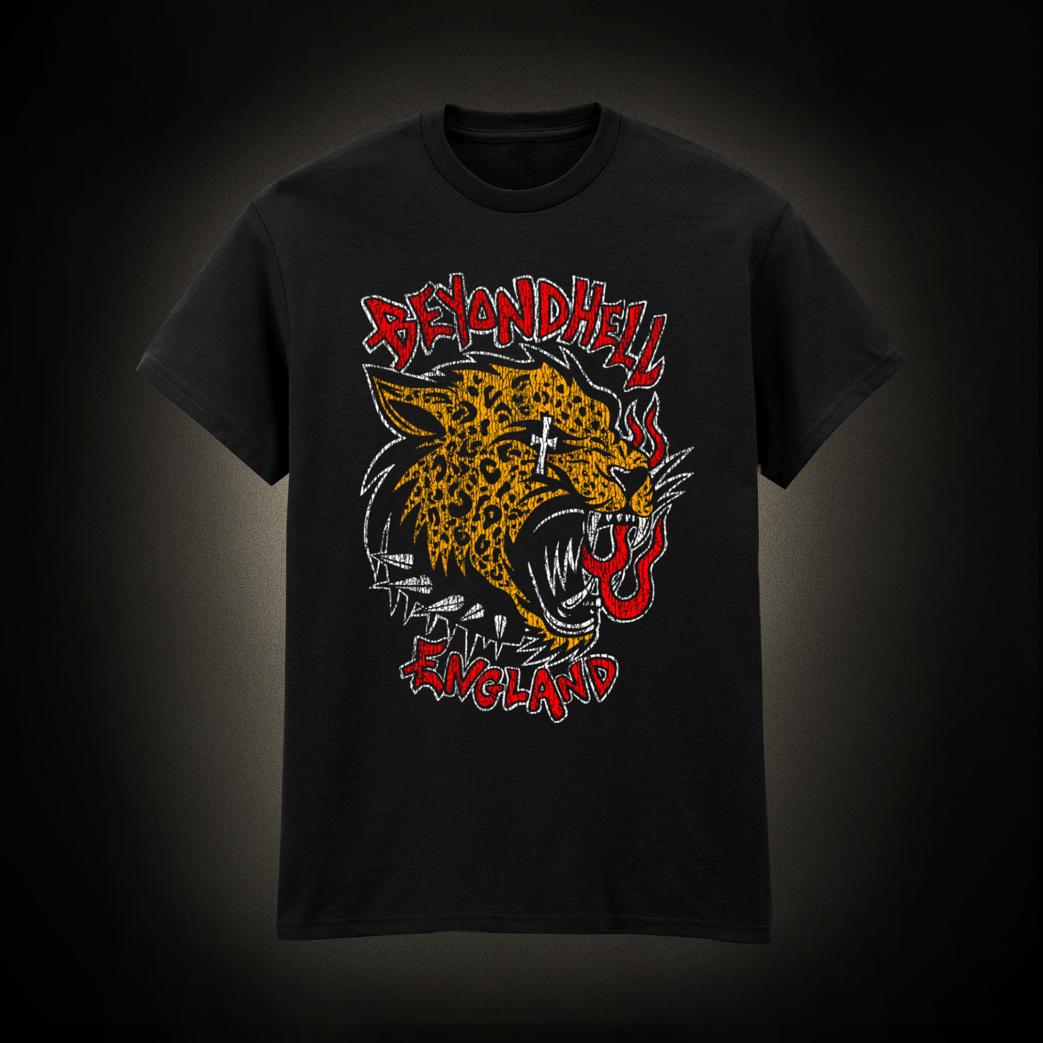 Beyondhell Leopard Tshirt - Printed Black Unisex T-Shirt. 100% Cotton. Please see last slide for size guide. THIS TSHIRT IS NOT DISTRESSED, if you want us to add some holes / slits like the vest version please leave a note 🖤